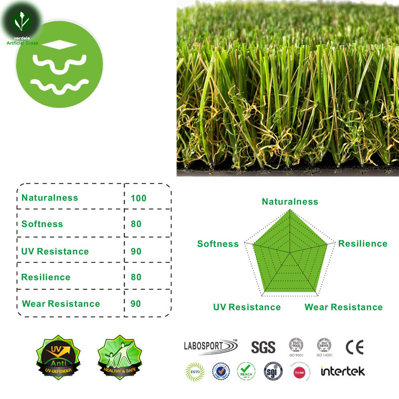 Cada hebra ha sido diseñada meticulosamente para ofrecer una superficie de lujo con una resiliencia sobresaliente. La combinación única de doble onda y patrón diamante mini proporciona una elasticidad superior que mantiene su forma perfecta incluso después de uso intensivo. Ideal para los clientes más exigentes que buscan lo último en césped artificial residencial.