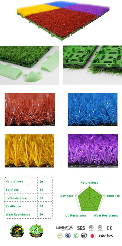 Superficie suave y colorida, ideal para jardines y zonas de juego.